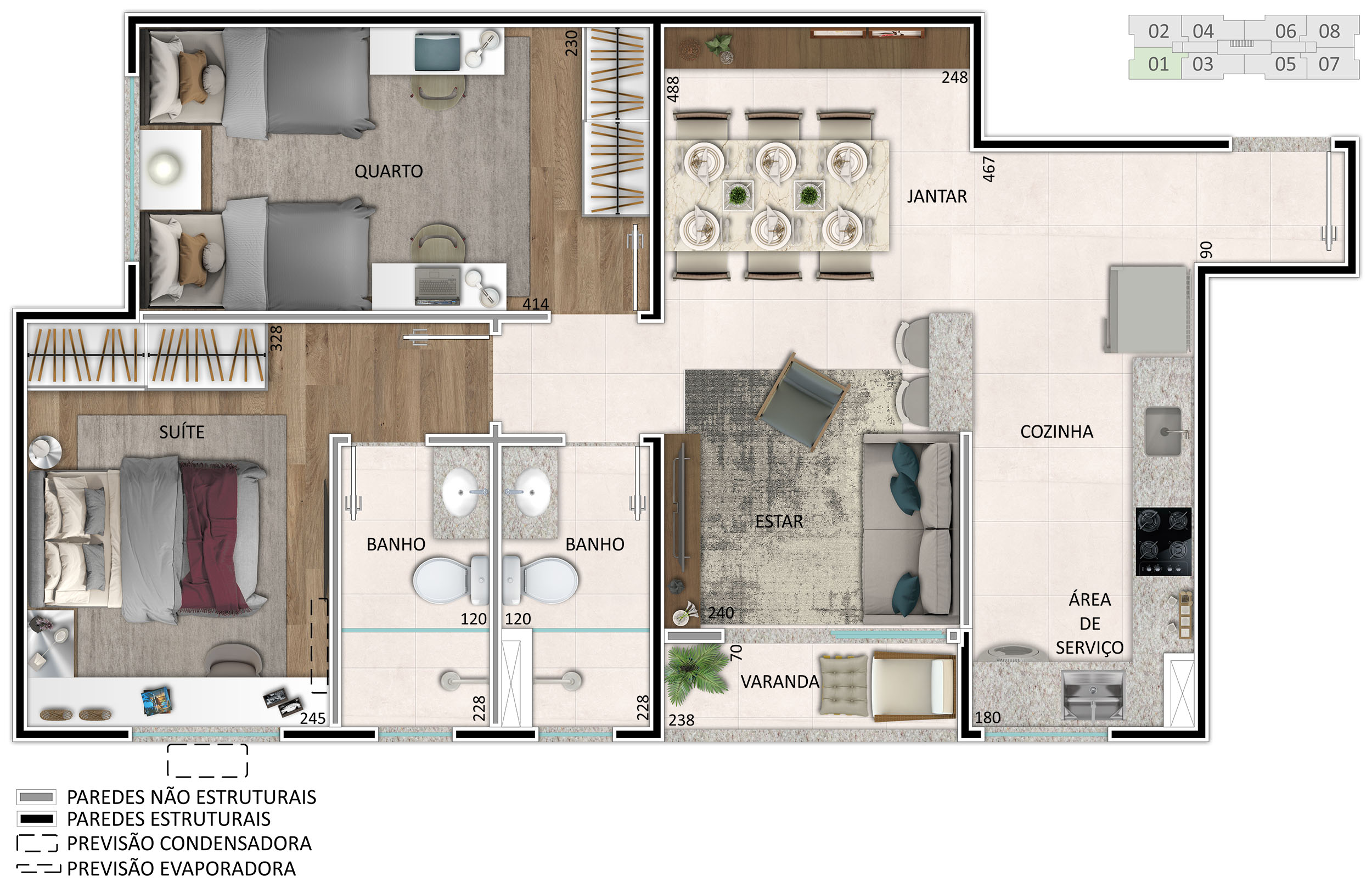 - Tomada USB na sala, Banheiro social revestido até o teto e Cozinha americana com bancada em granito.